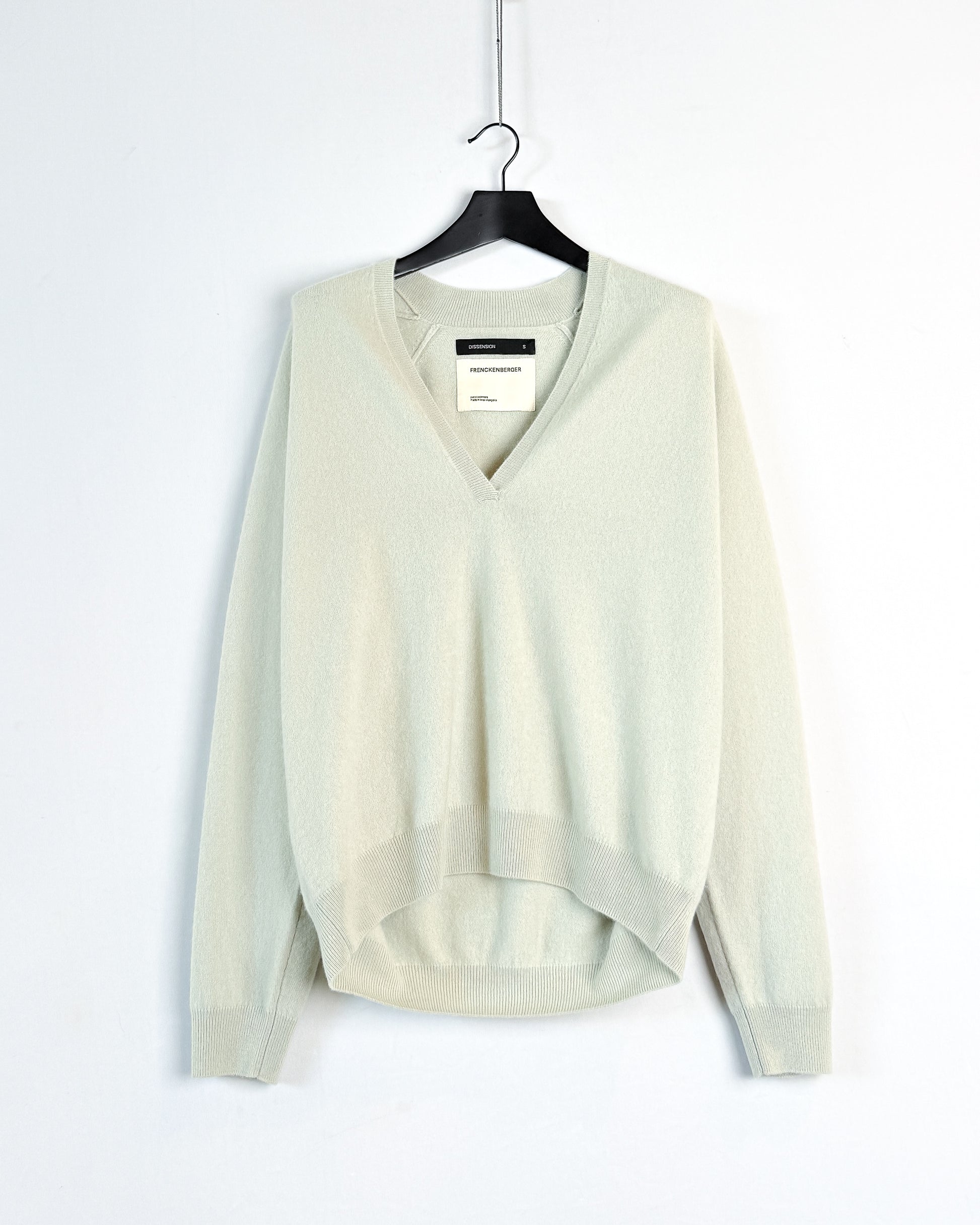 Länger geschnittener Pullover mit großem V-Ausschnitt.