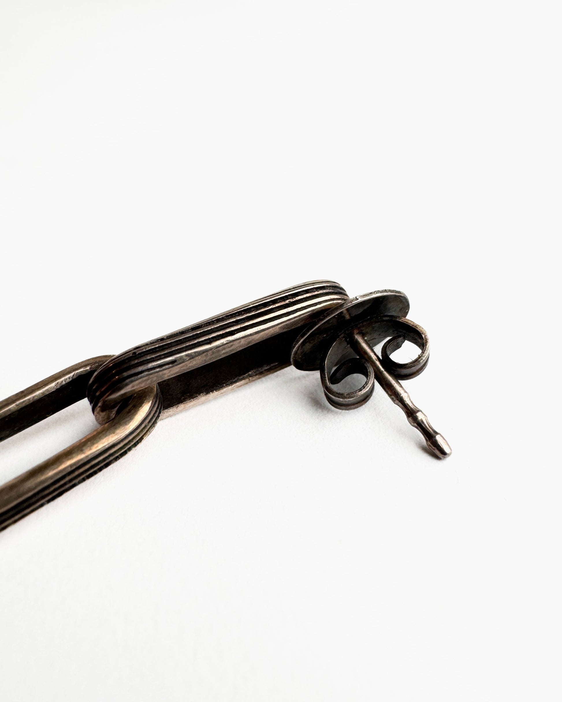 Ein Teil des Ohrrings zeigt nach vorne mit einer Linienprägung, während der andere um 90 Grad gedreht ist.