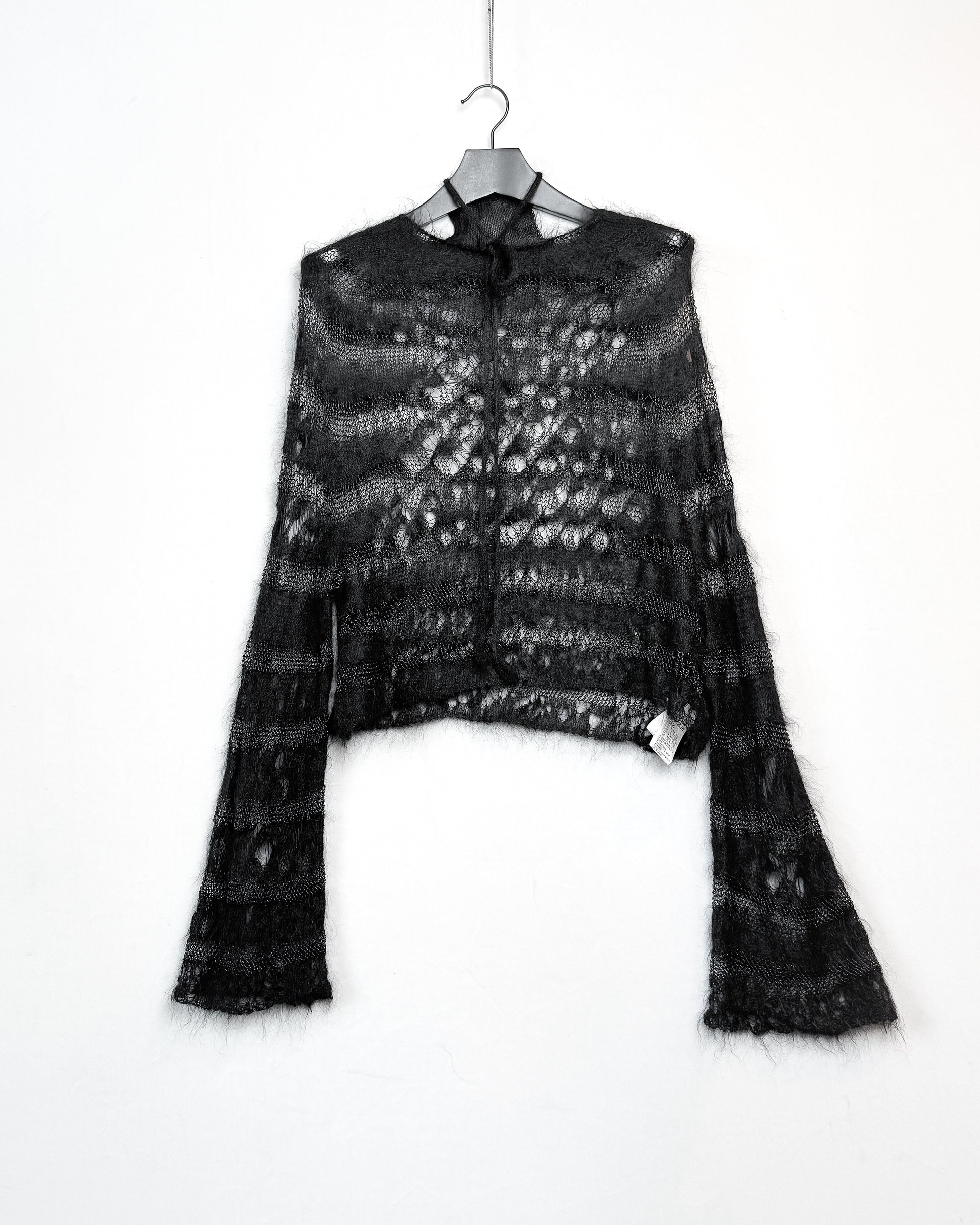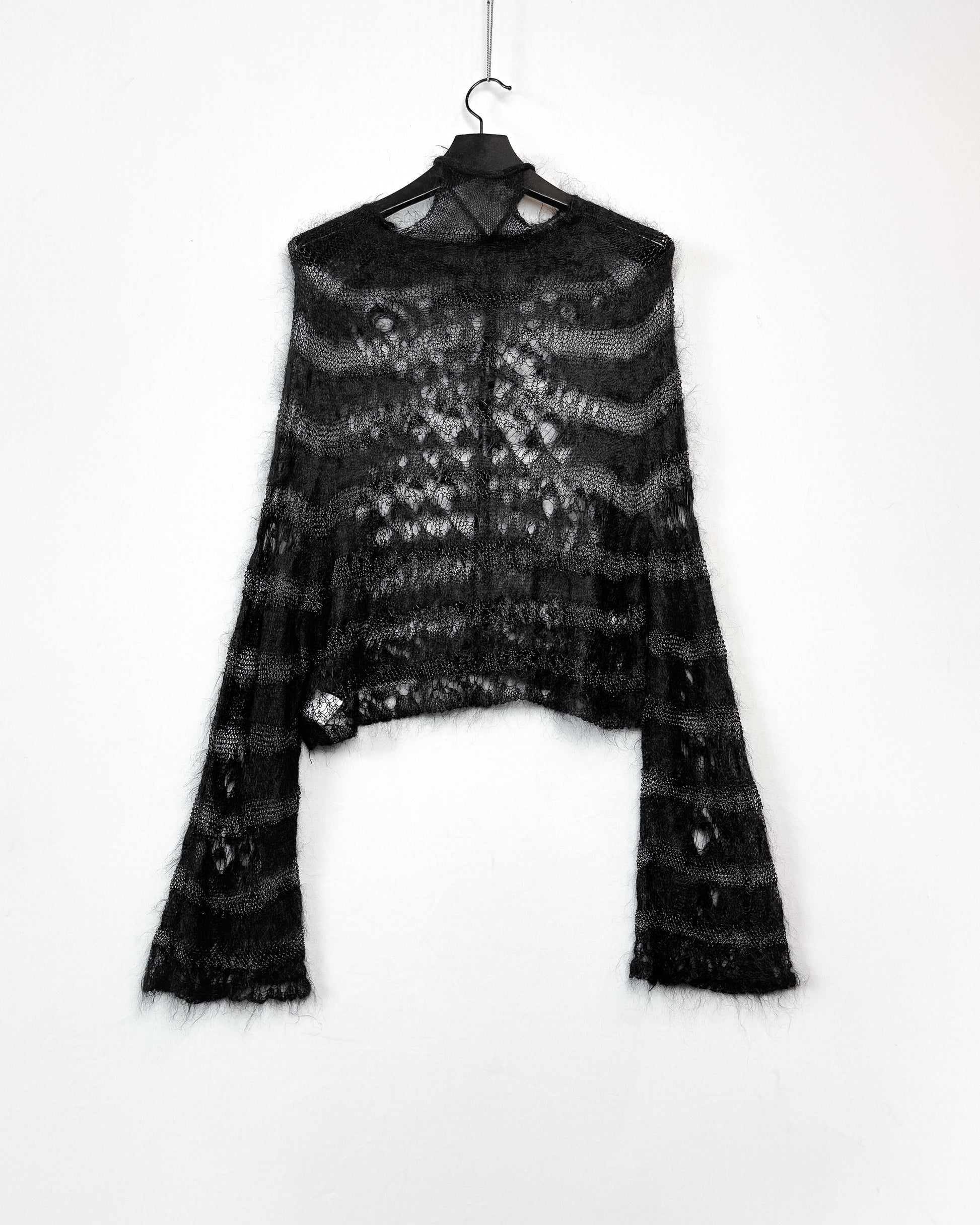 Löchrig gestrickter, verkürzter Pullover mit langen Ärmeln.